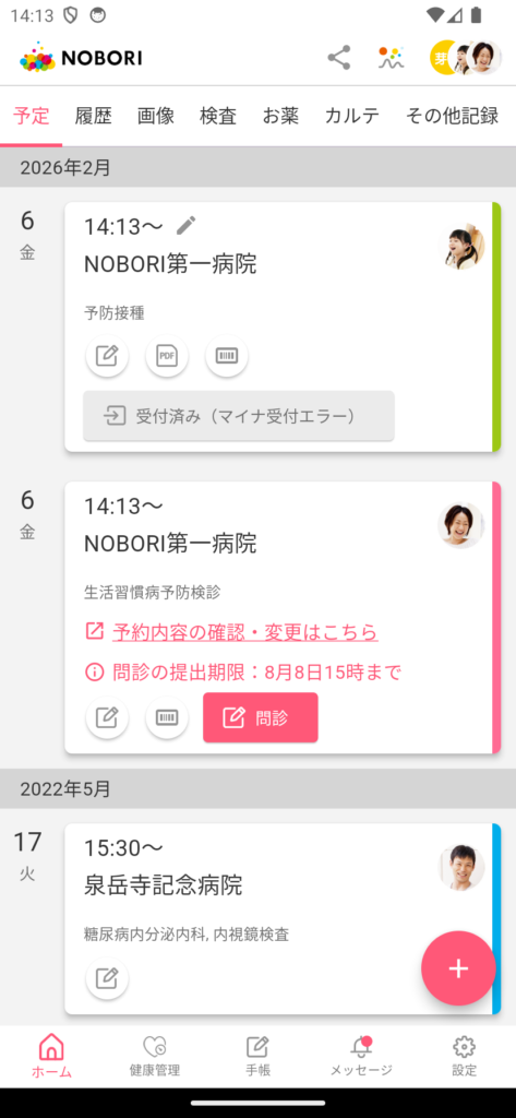 「NOBORIアプリを起動」をタップすると、NOBORIアプリが起動します。通院予定のボタンが「受付」から「受付済み(または「受付中」)」に変化します。
