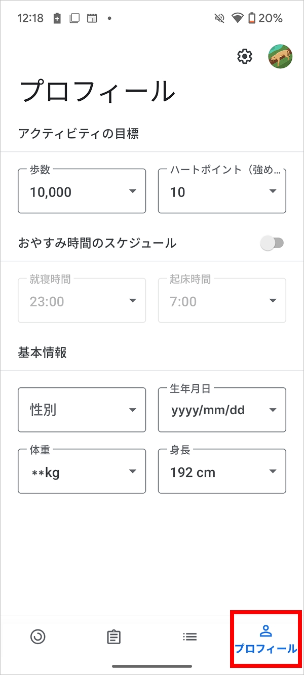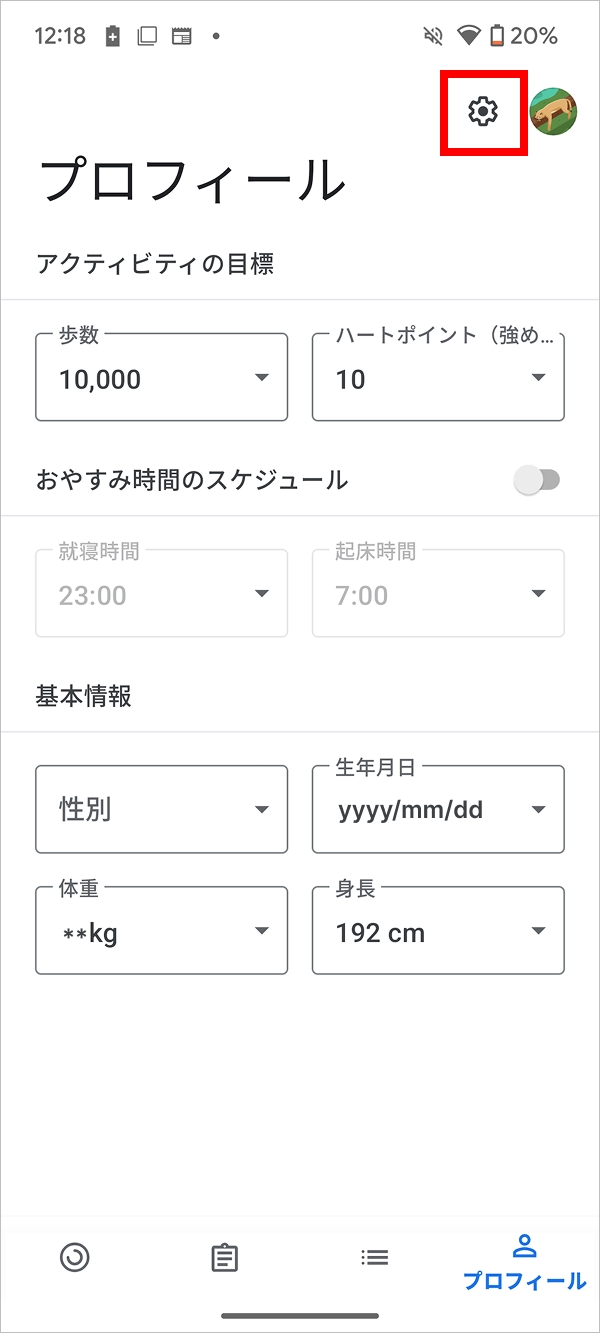 1. Google Fitを起動し、「プロフィール」>右上の設定アイコンをタップ