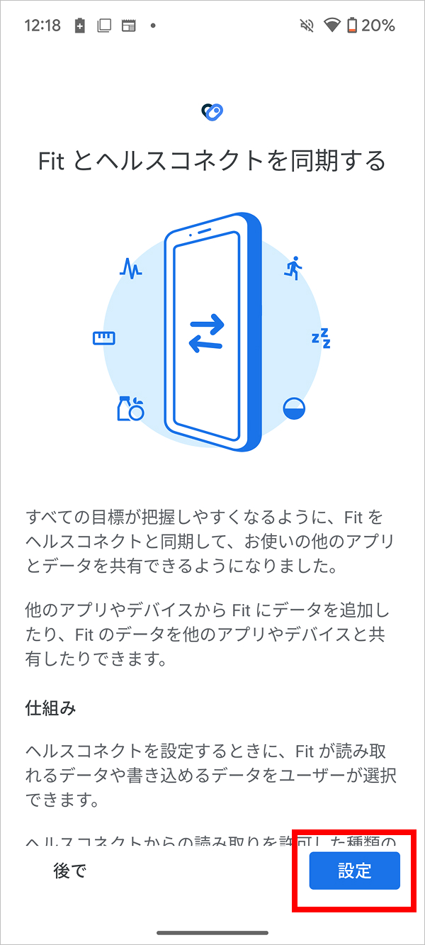 2. 「Fitとヘルスコネクトを同期する」をON>「設定」ボタンをタップし同期する