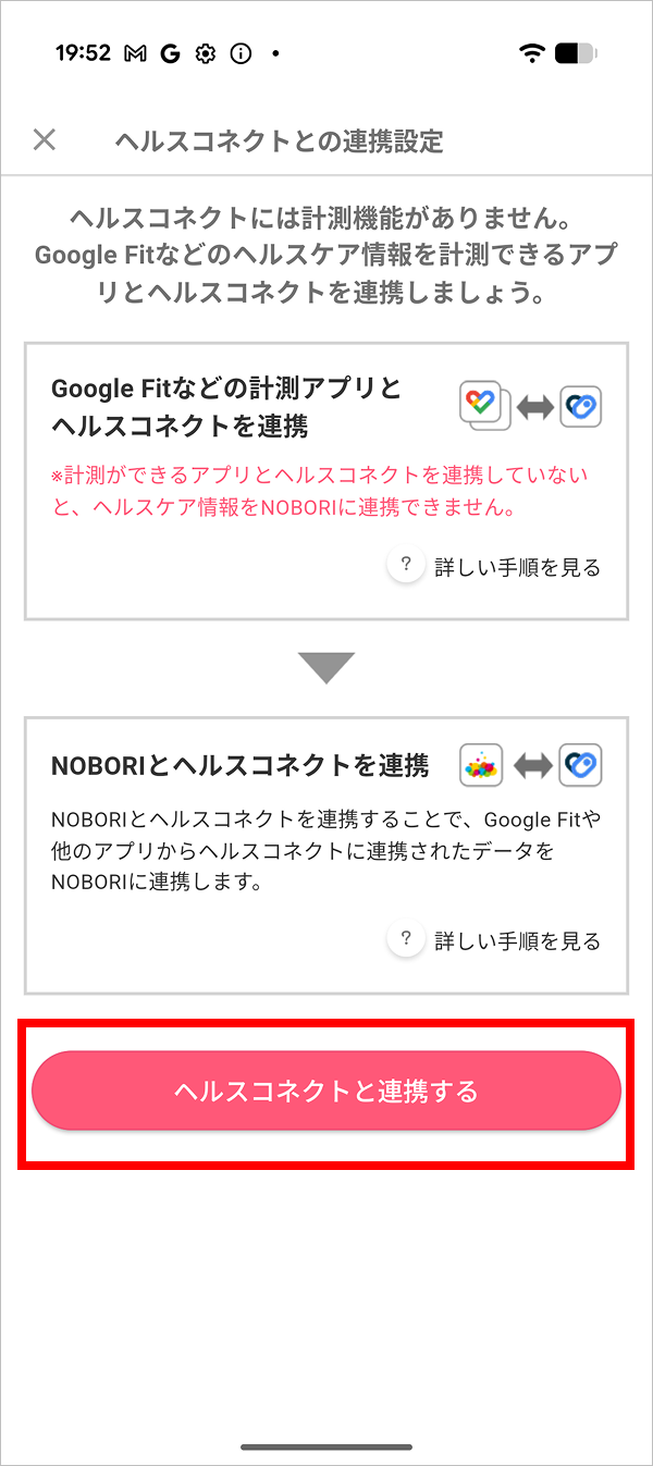 NOBORIでヘルスケア情報を取得するためには、Google Fitなどの計測アプリとヘルスコネクトを事前に連携し、ヘルスコネクトにデータを追加しておく必要があります。