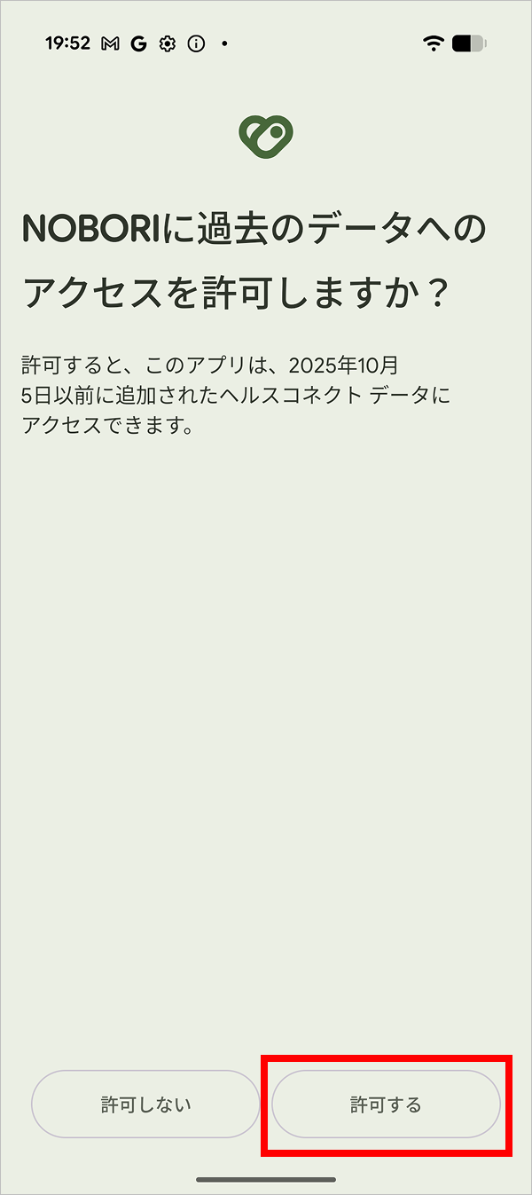 過去のデータへのアクセスを許可することで、30日間より前に登録したヘルスコネクト上のデータも取得できるようになります。