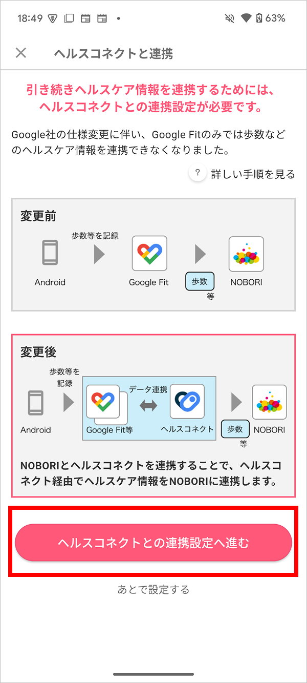 2. 「ヘルスコネクトとの連携設定へ進む」をタップ