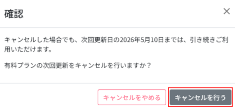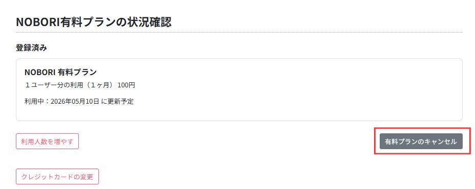 HOMEプランについてPC版で有料プランを解約したい UPDATE 2026.04.14 このページを印刷する PC版で有料プランを解約する方法 ログイン後に設定から、お支払い方法の設定をすることができます。 手順は以下の通りとなります。 1. 右上の「設定」をクリック 2. 「有料プラン利用中」をクリック 3. 「有料プランのキャンセル」をクリック 4. 「キャンセルを行う」をクリック #解約#パソコン#PC PC版で有料プランを解約したい PC版で有料プランを解約する方法 プランの確認 自分のプランの設定を確認する 有料と無料の違い NOBORI有料プランについて 一覧へ戻る よくあるご質問 一覧へ メールが届かない SMSが届かない その他の問い合わせ